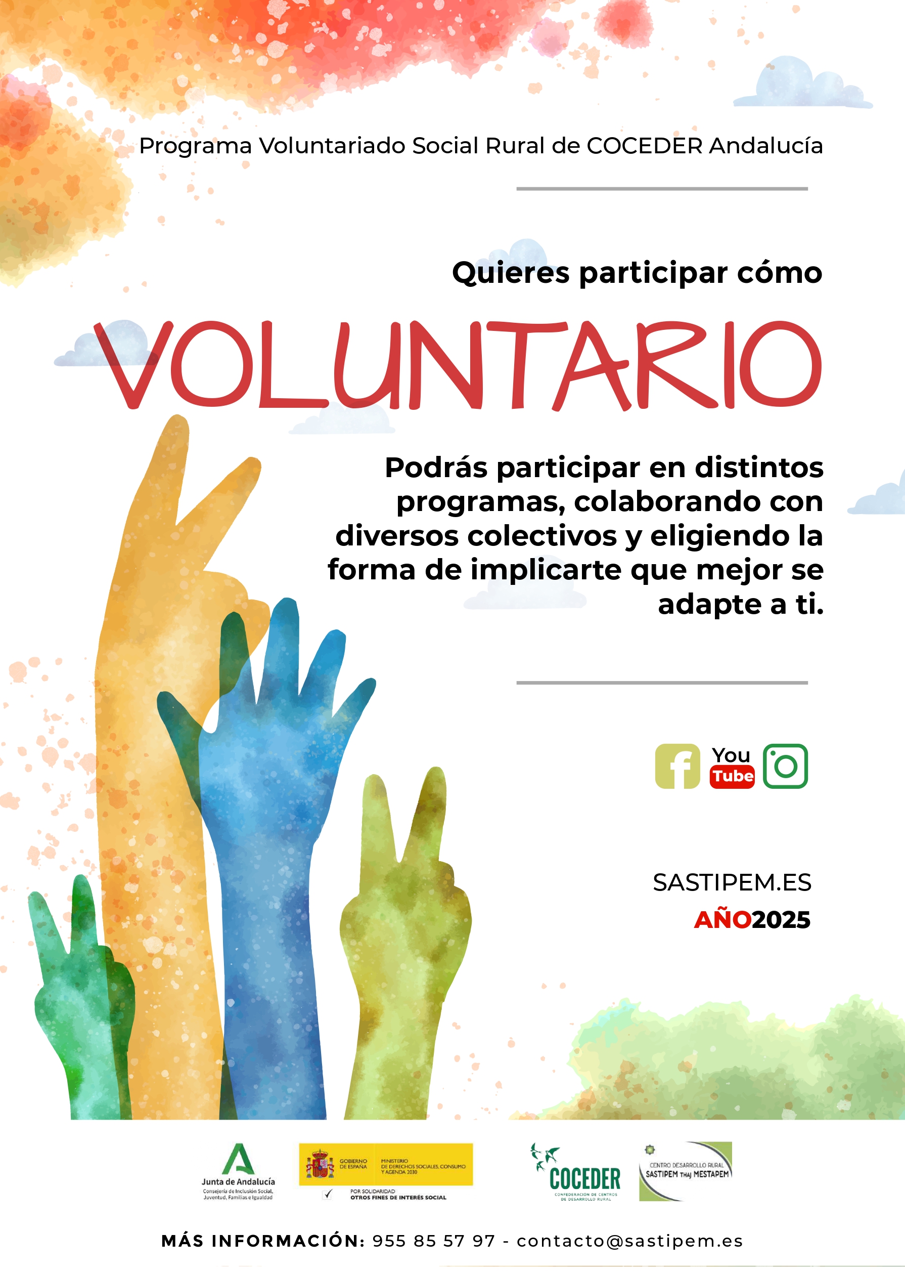 El voluntariado es uno de los instrumentos fundamentales de la acción civil en el ámbito social, y en el medio rural su valor es especialmente significativo. CDR SASTIPEM THAJ MESTAPEM pone en marcha el Programa Voluntariado Social Rural de COCEDER Andalucía, una iniciativa que da respuesta a la creciente demanda de participación voluntaria, especialmente entre jóvenes y estudiantes universitarios que desean adquirir experiencia directa con colectivos en situación de vulnerabilidad.